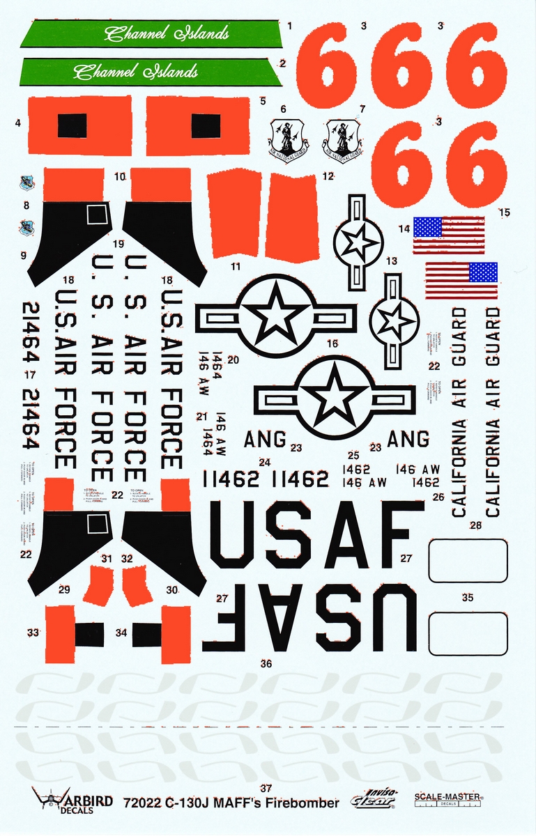 Warbird have been around for some time, but have sold mainly in the US, and as a result this sheet is not currently available in the UK. It provides markings for MAFF equipped C-130Js from the 115th AS, 146th AW, California ANG (this Air Guard being one of only a small number trained to perform the fire-fighting role). The airframes covered are:-