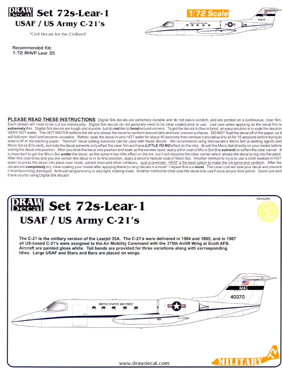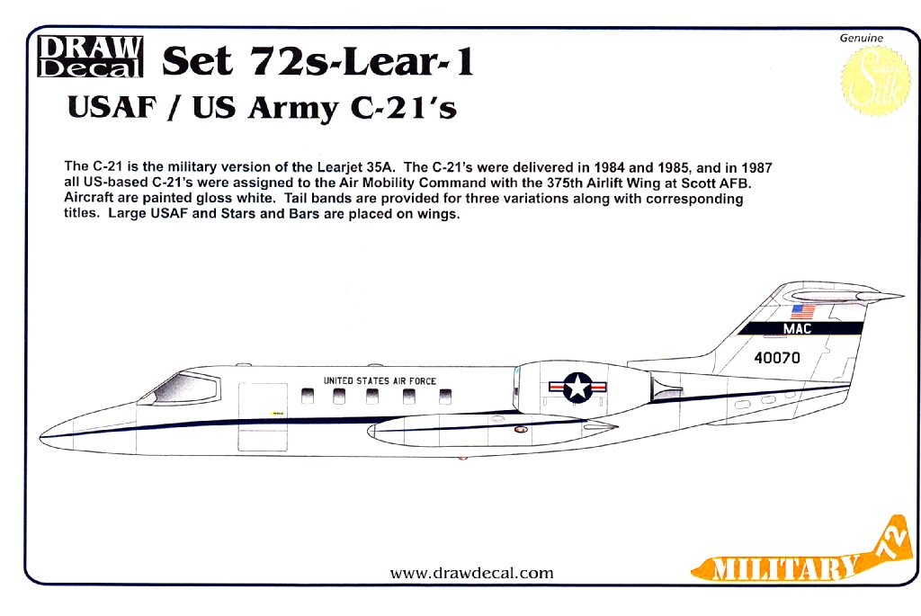 A sheet from Draw Decal for a relatively obscure subject - USAF/US Army C-21 Lear Jets.