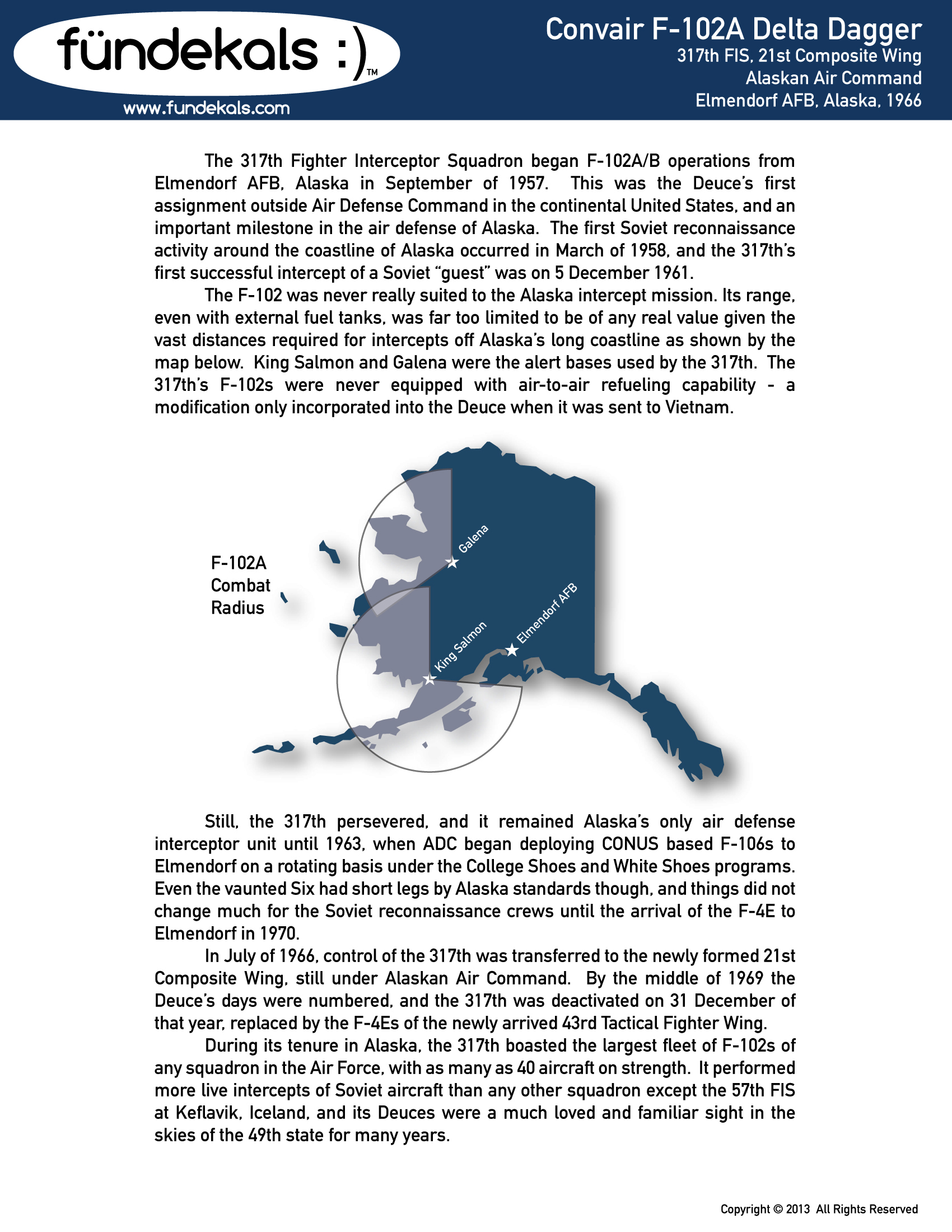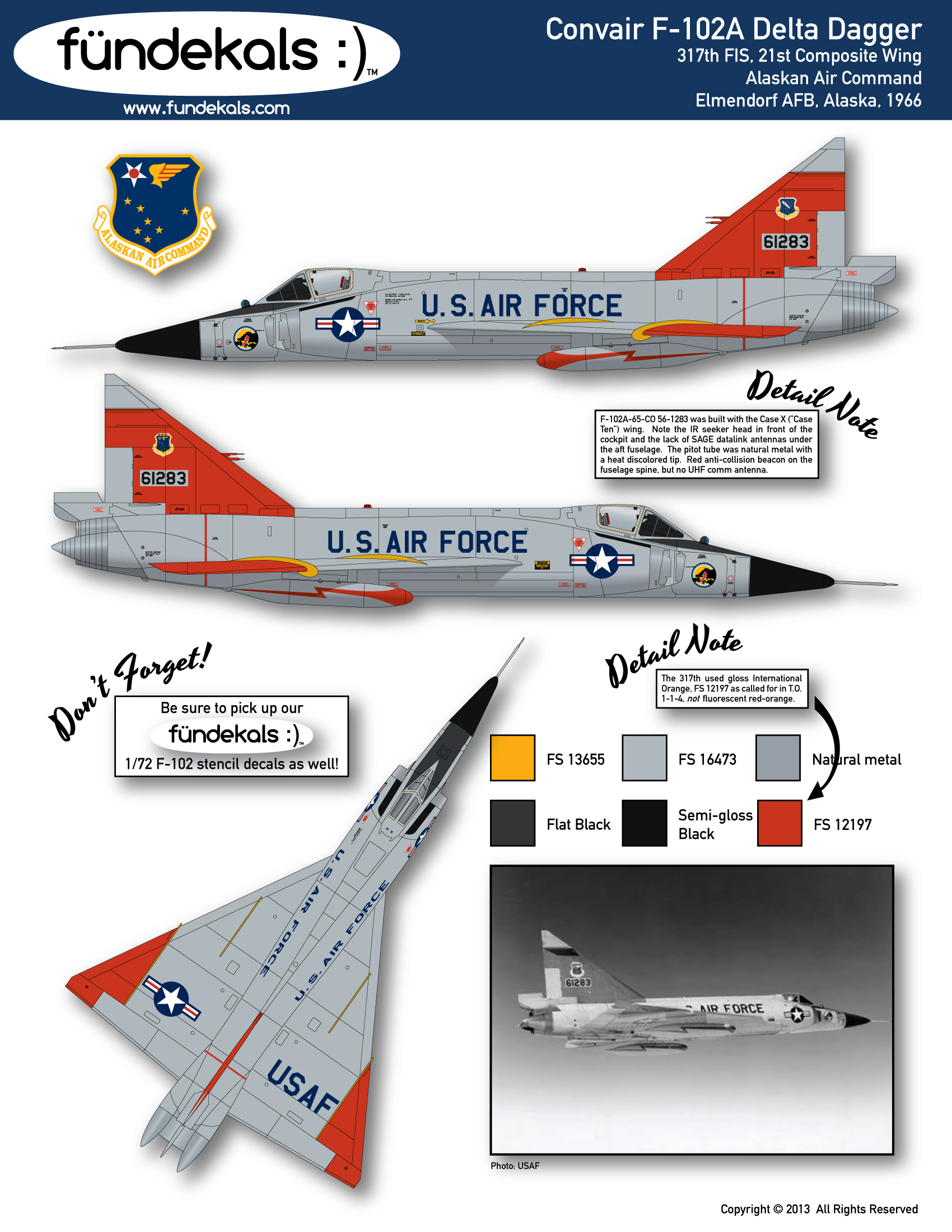 This sheet from Fundekals provides markings for an F-102A from the 317th FIS, 21st Composite Wing, Alaskan Air Command based at Elmendorf AFB, Alaska, during 1966.
