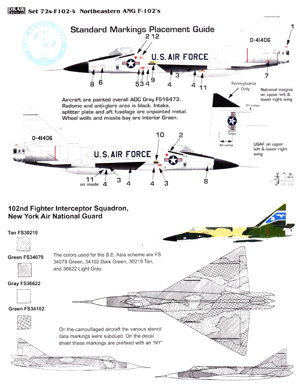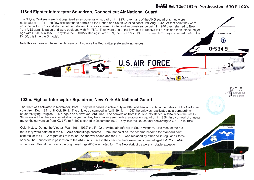 Draw Decal sheet 72s-F102-4 contains markings for 4 F-102As from Northeastern ANG units and covers Connecticut, New York, Pennsylvania and Vermont ANG aircraft. The aircraft featured are as follows:-