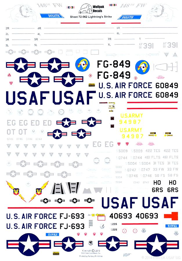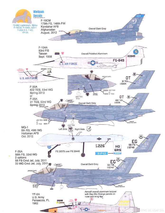 More interesting subjects from Wolfpak Decals. Sheet 72-062 is titled "Lightnings Strike" and features an F-16C from the 148th FW in the new "Have Glass V" scheme, as well as F-35As from the 33rd and 53rd Wings, an F-104A from the 83rd FIS, a Holloman based MQ-1, a YF-5A used by the US Army (!) and an F-4C from the 2nd AD in the original "Navy" scheme.