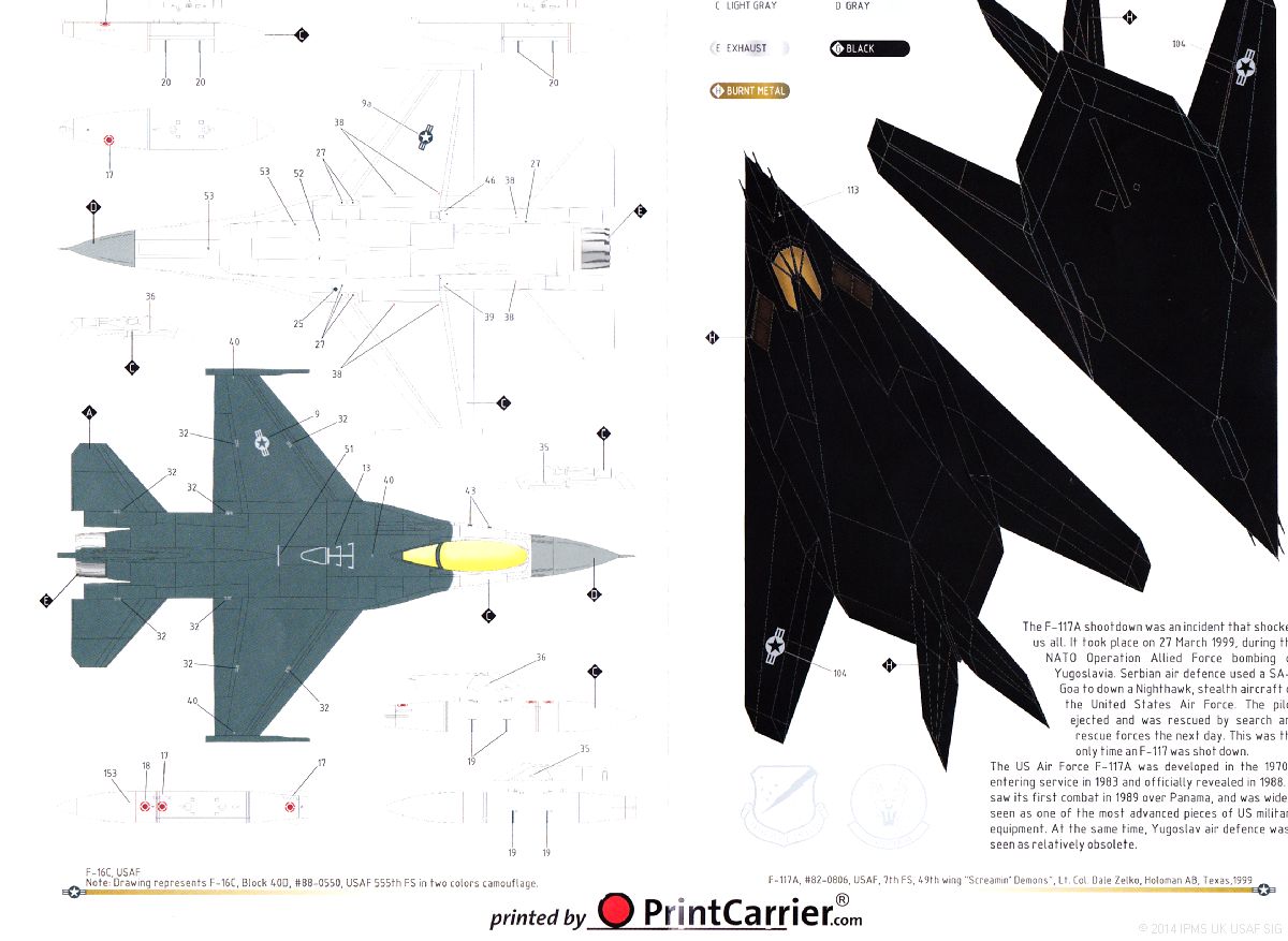 - F-117A 82-0806 from the 7th FS, 49th Wg based at Holloman AFB, Texas during 1999. Black overall with light grey "HO" tailcodes, markings and fin flash containing "Screamin' Demons".