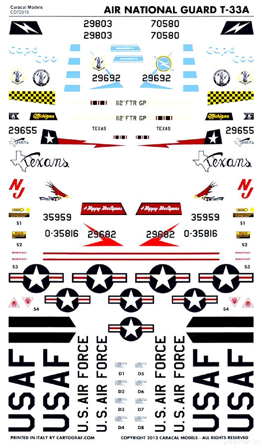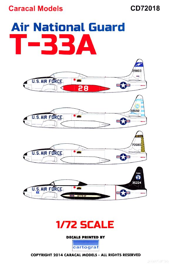 New markings for the T-33A have been thin on the ground, despite the recent release of the Sword and Platz kits. This new sheet from Caracal provides markings for aircraft from nine different Air National Guard units. The individual aircraft featured are:-