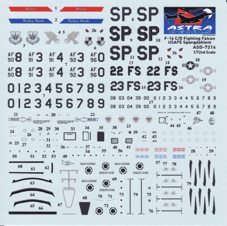 Latest in the range of decals from Astra, this sheet covers a number of aircraft from the 22nd and 23rd FS based at Spangdahlem AB. Few of the aircraft featured wear "special" schemes, but the upside is that the markings allow for any of 49 different airframes to be modelled!