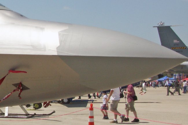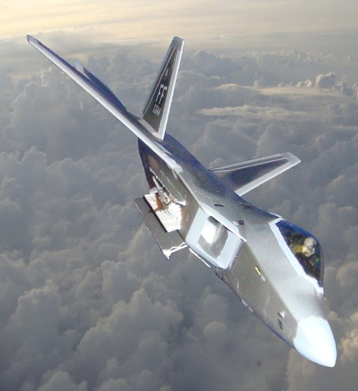The real challenge in building a model of the F-22 is duplicating the metallic sheen of its camouflage coating. As you can see from the photos, the coating can appear lighter or darker than the gray radome or other painted areas, depending on the sun angle. After getting used to Metalizer and Alcad II paints over the years, the prospect of spraying silver enamel was so daunting that I: 1) cleaned my study, 2) dusted my models, and 3) did my taxes to avoid painting the silver coats for as long as possible. Once I actually started, it only took about an hour from starting the first coat to being finished. (Of course, the masking leading up to the painting was a multi-night effort).