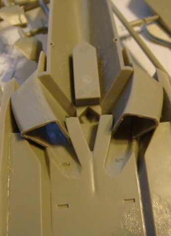 The top of the "back" side of the bottom missile bay (part 22) is the also bottom of the intakes. There is a small notch cut out of the "intake" (in front of the notch for the tabs for the back-off wall). These notches should be filled in.