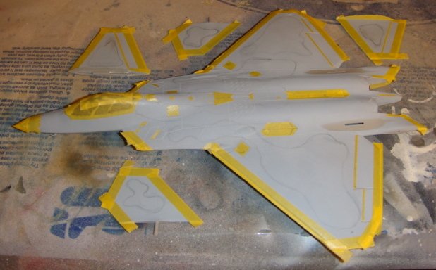 2) If desired, pre-shade selected areas dark gray. I got a LOT of questions about this at my local club. What I did after the Light Ghost Gray was thoroughly dry was to refer to photos and sketch the pattern of the darker silver gray pattern on the model. I then sprayed this pattern Gunship Gray (36118), not bothering to make it a solid coat. I then made a photocopy of the top of the fuselage, horizontal tails, and both sides of the vertical tails. I cut out the dark parts of these copies to make masks that were used after the light metallic silver had been applied.